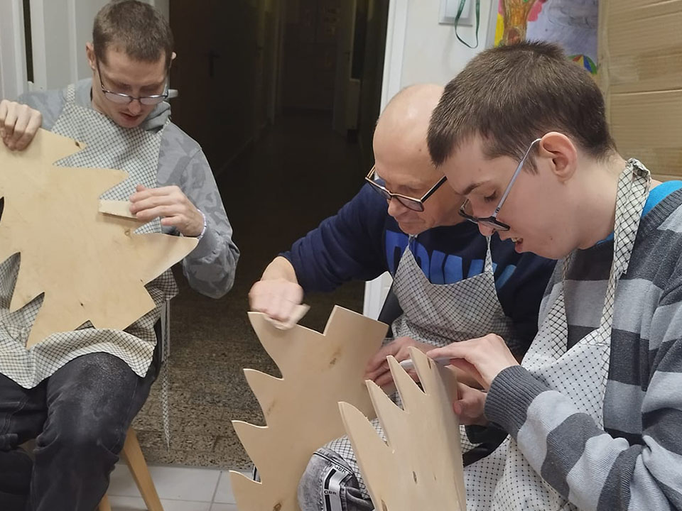 Pracownia terapii zajęciowej w naszym Domu oferuje chłopcom różnorodne zajęcia manualne. W trakcie tych zajęć uczestniczą w wykonywaniu prac ręcznych, które prowadzą do powstania szerokiej gamy wyrobów artystycznych, takich jak wyszywanki, kartki świąteczne, ozdoby, stroiki, obrazki i wiele innych. Chłopcy angażują się w różnorodne czynności, takie jak klejenie, wycinanie, przebijanie, malowanie i szycie.